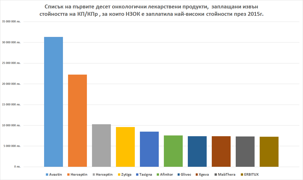 През 2015 г. първите 10 медикамента за онкологично лечение в болниците, за които НЗОК е заплатила най-високи стойности, са погълнали приблизително 50% от общия й бюджет по това перо, сочи справка на касата, предоставена на Mediapool по Закона за достъп до обществена информация.