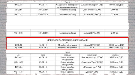 За следващата - 2015г. договорите са само три. Те са "Май Фай" АД за 3420 лв., с "Вестникарска група България" за 8510 лв. и пак с БТА, но този път за 2200 лв.