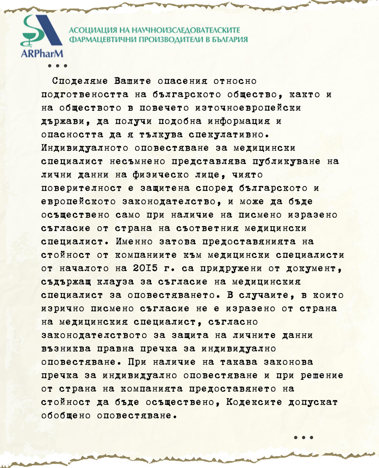 Показателно е и какво е отношението на някои от медицинските дружества към оповестяването на данните. Дружеството по неврология например е на мнение, че обществото ни не е узряло да получи тази информация – позиция, за която става ясно от кореспонденция между него и ARPharM.